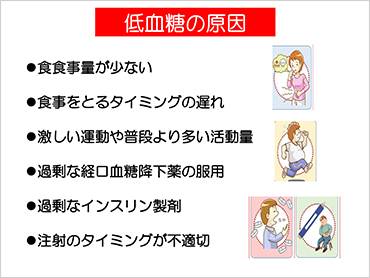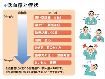 糖尿病は、インスリンの量や作用が不足して高血糖状態が続く病気です。糖尿病の治療中に血糖を下げる飲み薬やインスリンが効き過ぎて、血糖値が下がりすぎるのが低血糖です。低血糖を放置していると意識障害、昏睡などに陥って命にもかかわってきます。