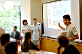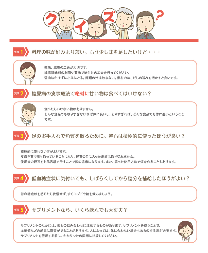 「糖尿病だったといわれる歴史的人物」「どうして糖尿病になるのか?」「糖尿病になると何がこわいのか?」「糖尿病と足のトラブル(足病変)」「足のお手入れ方法」「糖尿病治療で問題となる副作用」「低血糖への対処法」についてのお話と、グループに分かれてのクイズを行い大変盛り上がりました。