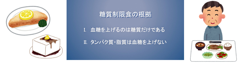 ご飯やパン、麺類や芋類、そして果物や砂糖は糖質を多く含むため血糖を上げやすい食べ物です。これに対して魚・肉・豆腐・チーズなどタンパク質や脂質が主成分の食品は血糖をあげません。この点に着目し、毎日の食事で糖質制限を行いながら血糖値のコントロールを行うのが「糖質制限食」です。