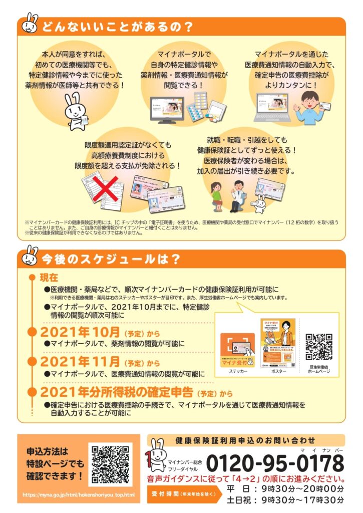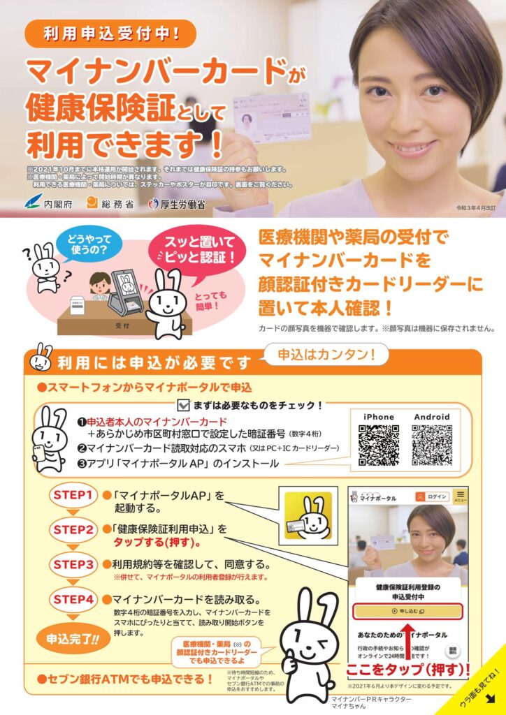 当院では、マイナンバーカードで保険証を確認する「マイナ受付」(顔認証付きカードリーダー)を開始しました。 これにより、マイナンバーカードで健康保険証としての利用ができることになりました。ただし、当面の間は健康保険証も併せてご持参いただければと思いますので、ご協力をお願いします。 また、診察券は、これまで通り毎回お持ちください。 https://myna.go.jp/html/hokenshoriyou_top.html マイナンバーの健康保険証利用(マイナポータル)